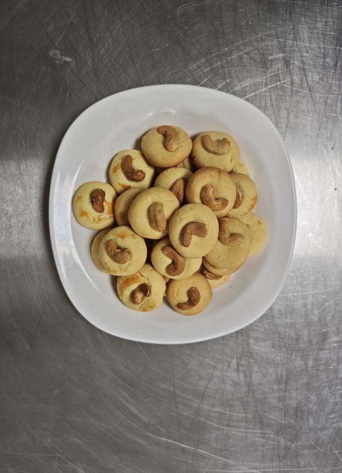 白案教学现场,韩跃娟演示“开口笑”与“腰果酥”两款特色点心的制作。“开口笑”以低筋面粉为主料,加鸡蛋、猪油增松软度,外裹芝麻提香;“腰果酥”严控黄油、糖粉配比,配腰果丰富口感,经控温烘烤制成,层次分明,契合师生对健康点心的需求。