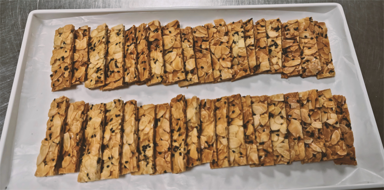 培训围绕“杏仁薄脆”与“巧克力慕斯”展开,其中杏仁薄脆以蛋白、黄油、杏仁片等为原料,精准解决糕点厂日常生产中蛋清复用难题,孟老师详细演示蛋白打发、杏仁片铺撒及烘烤控温技巧;巧克力慕斯采用黑白巧克力双拼设计,搭配淡奶油制作,旨在丰富校园西点品类,她重点讲解吉利丁融化、淡奶油打发及冷藏定型等关键步骤。