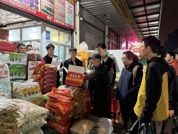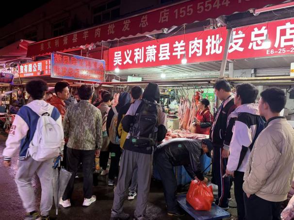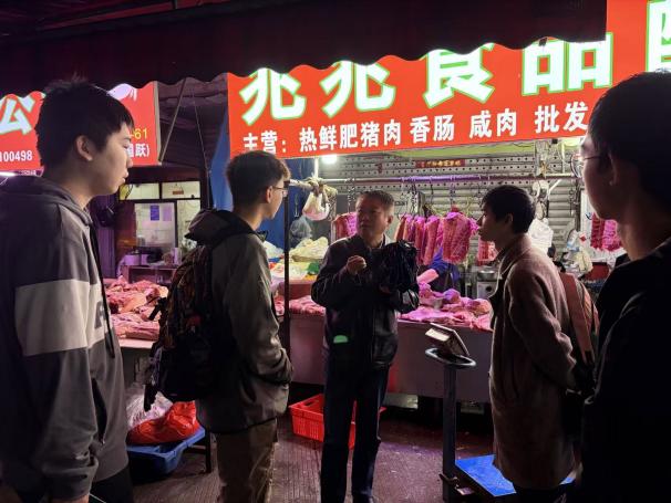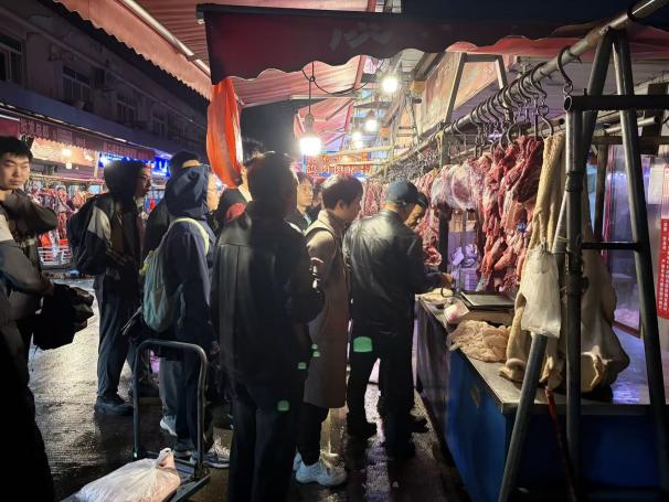 11月7日破晓前,晨光未露,参加“美食与生活”劳动实践课之“食堂体验官”的同学们跟随饮食服务集团采购老师一起,乘坐大巴车前往周谷堆农贸市场,观摩体验食材采购工作。采购老师介绍,为保障食材的新鲜度并提高周转效率,采购人员几乎每日清晨都会来此采购食材,无论寒暑,从未间断。在老师的引导下,同学们依次走访了生鲜肉食、干杂调料等多个采购区,现场目睹了采购环节中对食材品质的严格检验,并对物资准入流程的规范性与透明度有了清晰认知。整个采购过程公开透明,面对同学们的积极发问,老师们均给予了详尽解答。此次沉浸式的实践体验,不仅让同学们对“舌尖上的安全”有了更具象的体会,更让同学们读懂了采购工作者“以晨光为序、以细节为纲”的坚守与担当。