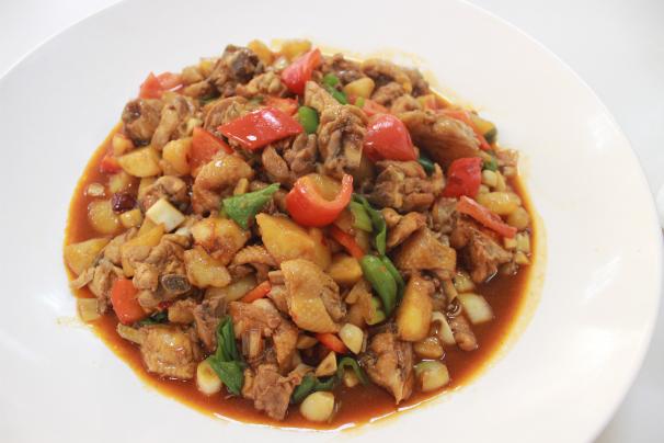随后,东区教工餐厅副经理杨俊作为专业烹饪老师,为同学们系统讲解了大盘鸡的饮食文化背景与基本烹饪原理。实践环节中,同学们在杨老师的示范指导下分工协作,开启了“从食材到佳肴”的创造之旅:从鸡肉的清洗切块、青椒与土豆的改刀备料,到依次下锅翻炒、掌握火候调味炖煮,再到最后铺上“皮带面”收汁入味。当一大盘色泽浓郁、香气扑鼻的大盘鸡出锅时,鲜美的鸡肉裹挟着香料的层次,吸饱汤汁的面条柔韧入味,同学们围绕在桌前,脸上洋溢着自豪与满足的笑容。