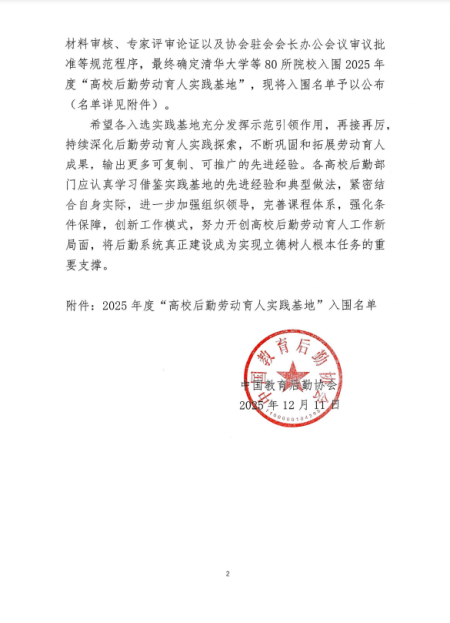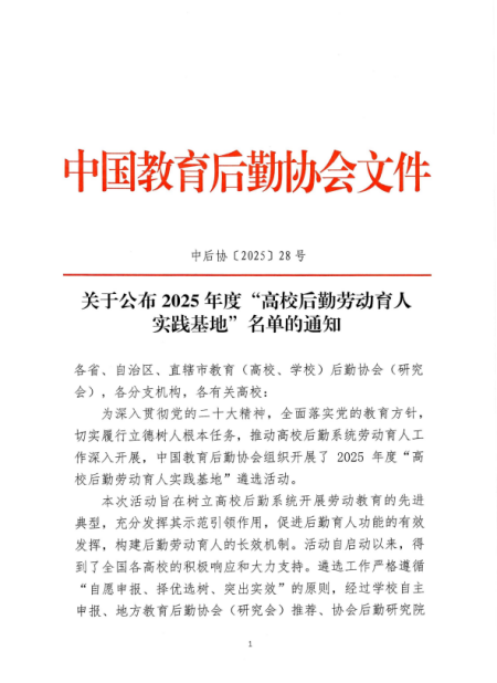 近日,中国教育后勤协会发布公告,中国科学技术大学成功入选2025年度“高校后勤劳动育人实践基地”。作为学校后勤劳动育人工作的重要参与力量,饮食服务集团提交相关评选材料,集中彰显了立足餐饮服务特色、以实践赋能育人的扎实成效。