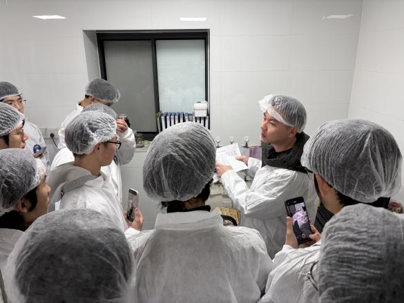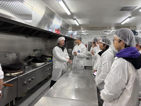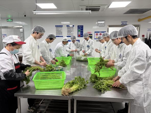 在工作人员引导下,同学们按照“生进熟出”的标准流程,系统参观了仓储管理、食材清洗、切配加工、烹饪制作到食品留样的完整生产动线,亲眼看见了专业厨具的规模化运作。参观结束后,同学们分组体验了包饺子和摘菜叶的实际操作。通过亲身参与,大家不仅感受到后厨劳动的细致要求和团队协作的重要,也将对餐饮服务的理解从“用餐者”转向“参与者”,真切体会到一餐一饭背后的辛勤付出与专注匠心。