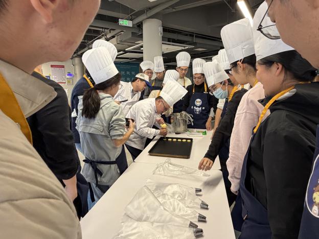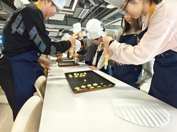 之后,同学们在饮食服务集团糕点厂西点师向泽勇老师的指导下,学习制作曲奇饼干。从打发黄油糖粉、分次加入蛋液,到筛入低筋面粉搅拌均匀,再到裱花成型、入炉烘烤,大家在操作中掌握了原料配比与关键手法,也感受到温度与时间赋予食物的奇妙变化。在协作与等待中,同学们体会到劳动带来的满足与喜悦。