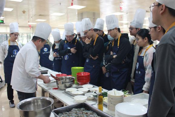 随后,西区教工餐厅副经理江道兵为同学们讲授“蒜蓉粉丝虾”的专业烹饪课程。从鲜虾开背去线、料酒腌制,到粉丝泡软铺盘;从调制金黄与生蒜相融的蒜蓉酱,到整齐排虾、浇酱蒸制;最后撒葱花、淋热油,一道香气四溢的菜肴便顺利完成。在师傅的逐步指导下,同学们亲手体验了从处理食材到成品出锅的全过程,不仅学会了家常菜的烹饪技巧,也领悟到一餐一饭背后所需的细致与匠心。