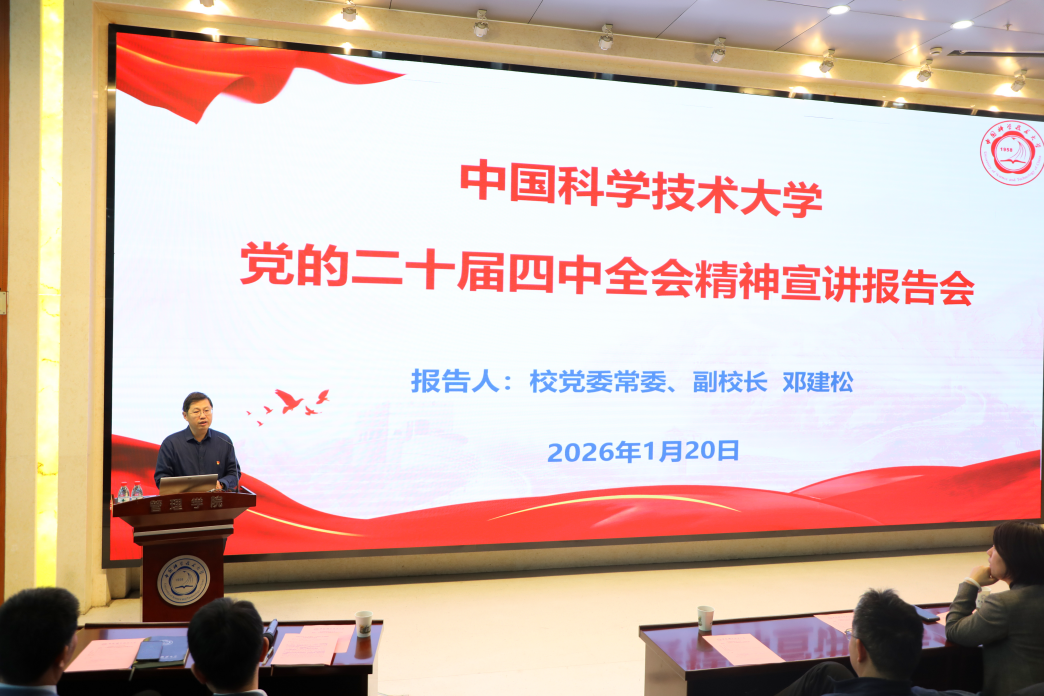 邓建松以《不懈努力、接续奋斗,全面推进强国建设民族复兴伟业》为题,从党的二十届四中全会的基本情况和重大意义、“十五五”时期在基本实现社会主义现代化进程中的重要地位、“十五五”时期经济社会发展的指导方针、主要目标、战略任务和重大举措、坚持和加强党的全面领导等方面系统阐释党的二十届四中全会精神及《中共中央关于制定国民经济和社会发展第十五个五年规划的建议》的核心内涵。报告还结合学校实际,回顾了学校“十四五”时期在学科建设、科技创新、人才队伍和校园基础建设等方面取得的成果,深入剖析了当前学校发展面临的机遇与挑战,明确了未来学校发展的目标任务,重点强调了打造教育科技人才一体发展示范区,加快建设中国特色、科大风格的世界一流大学。