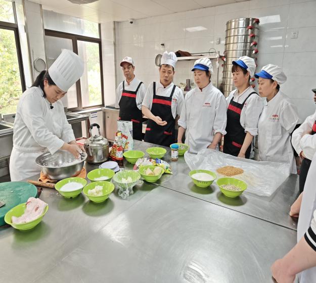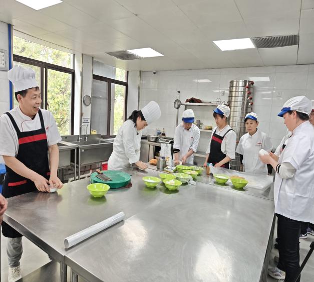 参训厨师们专注观摩,积极提问。武姗姗老师逐一解答,并手把手指导关键手法。尽管两款点心制作难度较高,参训厨师们仍通过学习,在粉类特性、馅料搭配等方面收获颇丰。大家将结合食堂实际条件,适时尝试上架,进一步丰富师生的用餐选择。