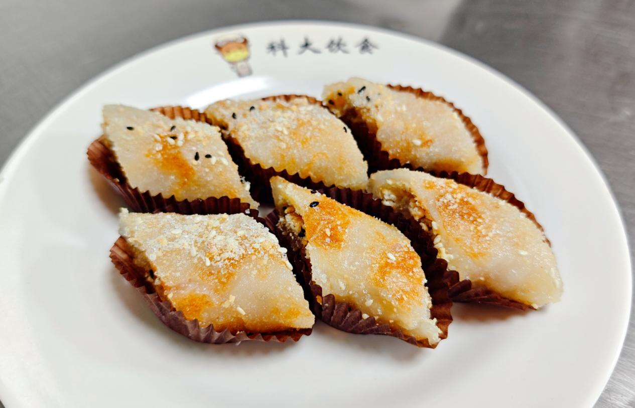 糯米薄撑是广东传统名点,外皮由糯米粉、烫熟澄面、猪油及食用油调和,煎制后外层酥脆、内里软糯。馅料以烤熟去皮的花生米、黑白芝麻研磨成碎,加入白糖与甜奶粉拌匀,香甜适中。武老师现场示范了摊皮、翻煎、撒料、卷制等步骤。