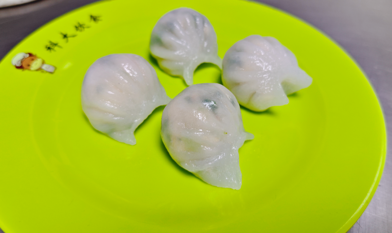 翡翠虾饺外皮以风车生粉、澄面按比例调制,加入少许猪油揉制,馅料选用青虾仁搭配肥膘肉、荠菜等,经调味、搅拌、冷藏后包制,经蒸制后晶莹剔透、口感弹韧。武老师重点演示了澄面烫制、拍皮包褶等关键手法。
