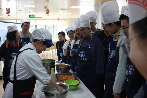 南区学生食堂余海师傅担任专业课老师,通过图文讲解与趣味问答,向同学们介绍青团的食材配比、操作要点与民俗内涵,并现场示范包制手法。