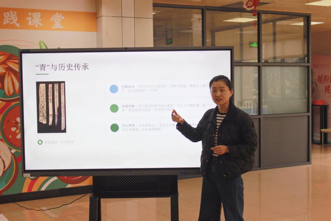 课程伊始,本科生院副主任王童以 “青绿之间 —— 从传统色谱到科学匠心”为题,带来一堂兼具文化和思想的思政课。王老师以 “青” 字为切入点,探寻汉字里的色彩浪漫,追溯文化演变脉络,解读东方美学内涵,赏析汝窑天青釉与《千里江山图》的传世之美。她将青团的艾绿与国人审美追求相结合,阐释色彩的疗愈力量,并以 “做一枚有‘底色’的少年班人” 寄语学子,勉励大家坚守初心、锤炼品格,青出于蓝而胜于蓝。